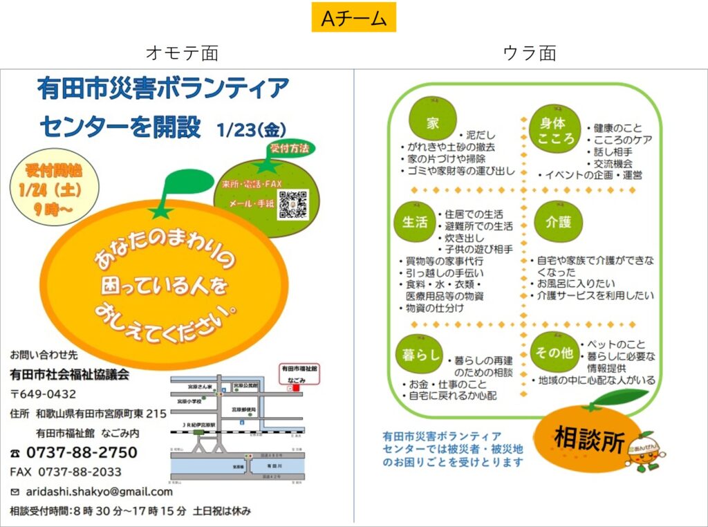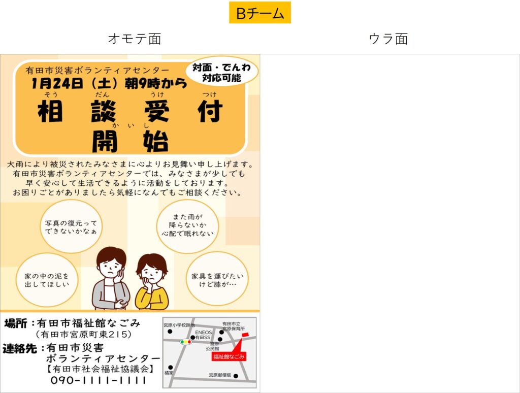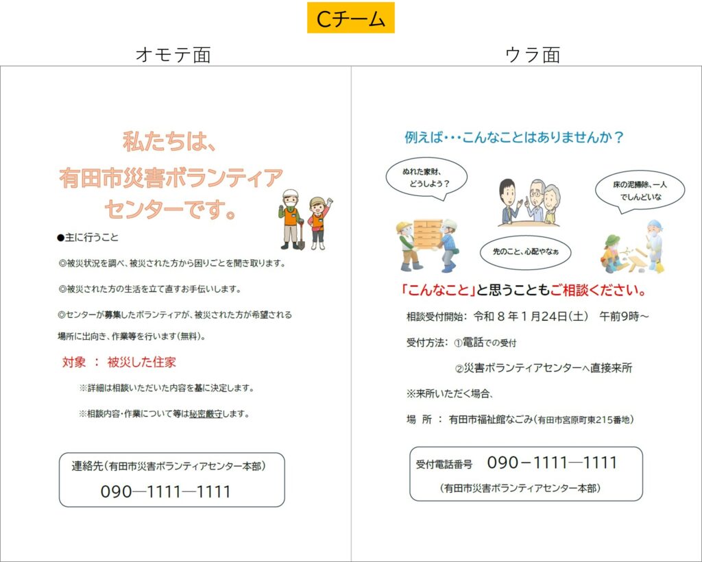 チームコメント:【両面】災害ボランティアセンターが何をするところなのかが分かるように表面に詳しく書きました。