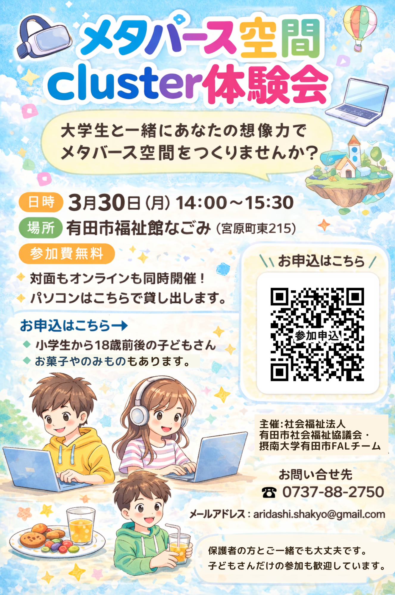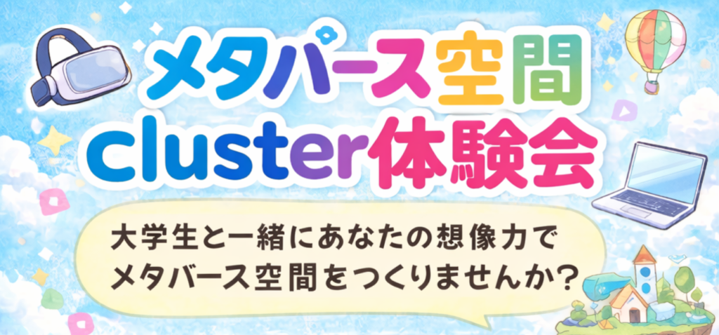 今回は体験会として、子どもたちにメタバースの楽しさを気軽に体験してもらえたらと思っています。メタバース空間「cluster」で、摂南大学の大学生たちと、自分たちだけの空間をつくったり、自由に動き回ったり、ワクワクする体験をしてみませんか?