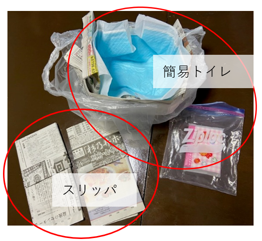 (参考例 新聞紙スリッパと防災簡易トイレ)