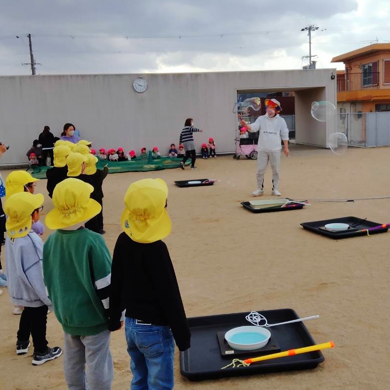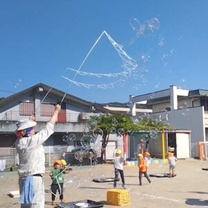 バブルショーでは、はじめにいろんな道具を使ったショーを見てもらい、次に年長さんにはその道具を使って園庭で一緒にしゃぼんだま遊びを楽しみました。2mを超える大きなしゃぼん玉や、一振りで20個以上のしゃぼん玉を作ったり、飛んでいくしゃぼん玉を夢中になって追いかけ回り、大盛況でした。